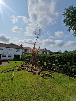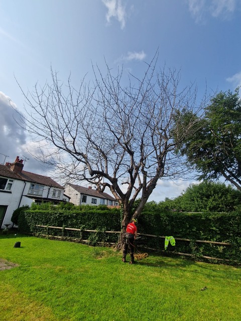 A Cherry tree takedown on an overcast day in Pen-y-Ffordd, Flintshire. All the brash was chipped and removed from the site and the customer kept all the logs.