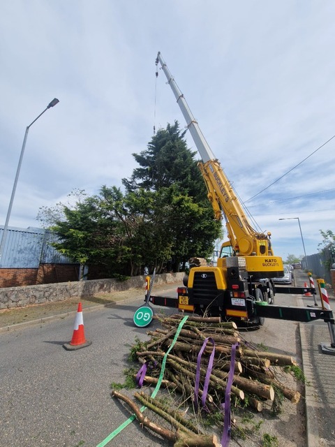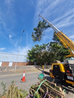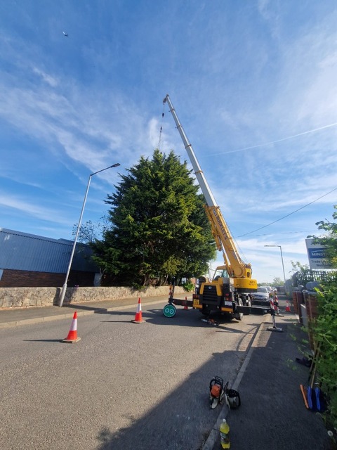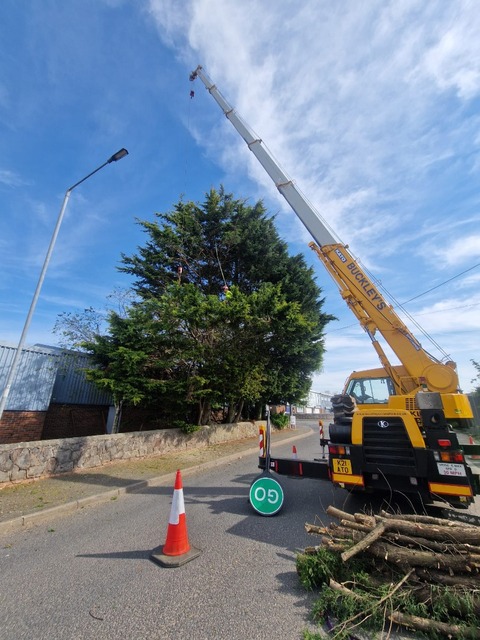 For safety (the proximity of the road) and speed a crane was used to facilitate the reduction and removal of limbs and branches.