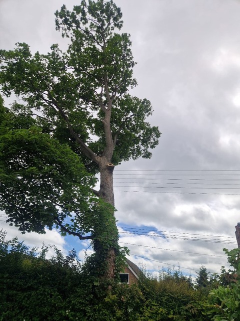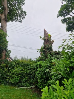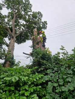 To take down and remove a wind damaged tree stump for Flintshire County Council on an overcast day in June. As a safety measure the electric wires had to be switched off. We also deadwooded (removed dead branches/limbs) from a Sycamore tree.